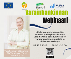 Varainhankintawebinaari järjestetään osana Nokian maaseutuhelmet-hanketta. Webinaariin ovat tervetulleita kaikki aiheesta kiinnostuneet! Maaseutuhelmet- hankkeella tavoitellaan yhteisöllisyyttä, kyläyhteisöjen aktivointia ja toimintatapana on yhteissuunnittelu osallistavia työmenetelmiä käyttäen. Hankkeen kautta kylille jaetaan tietoa omaehtoiseen kyläkehittämiseen, hankeosaamista, digitaitoja, tapahtumatuottamisen taitoja sekä markkinointi- ja tuotteistamisosaamista.